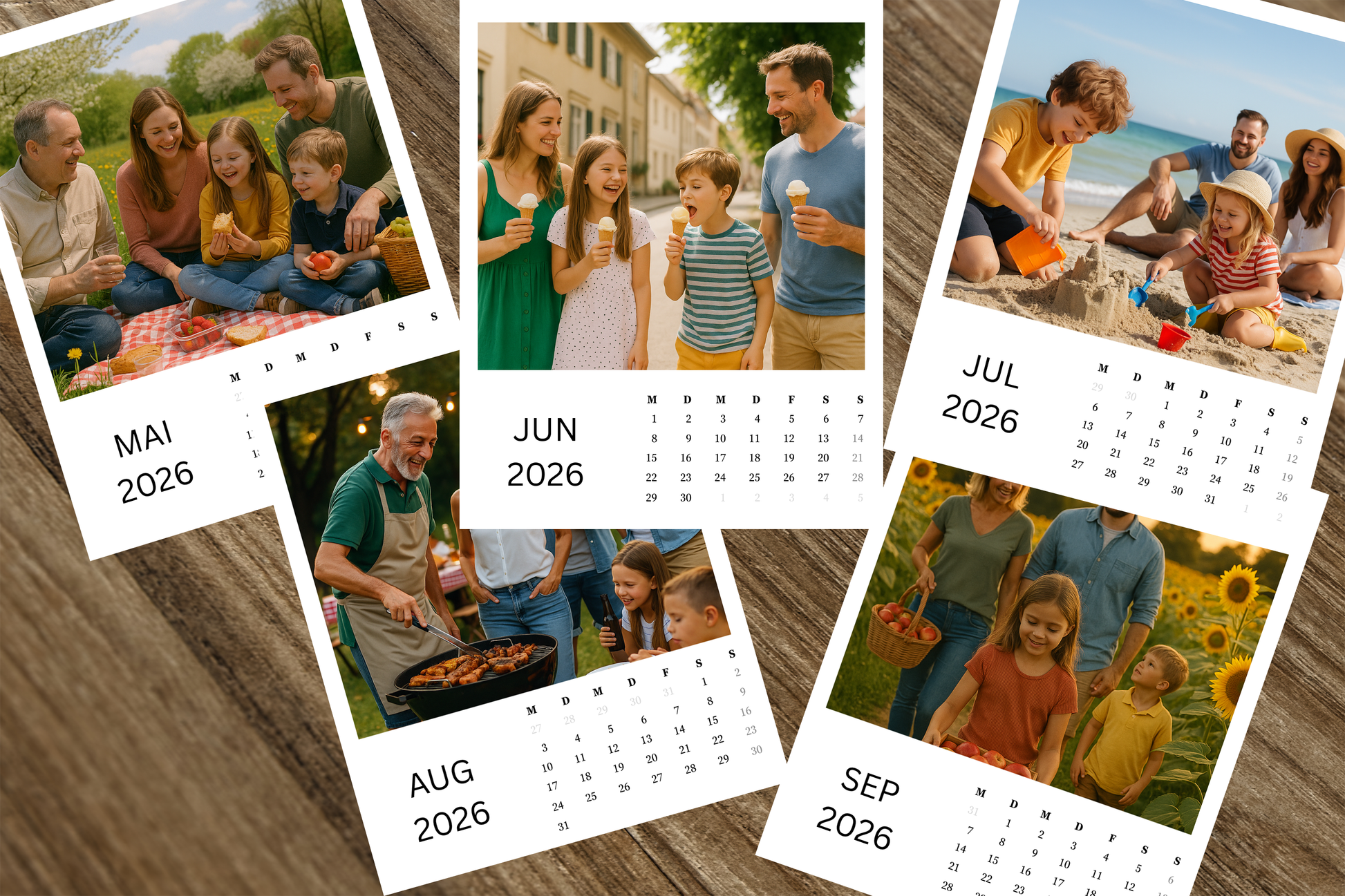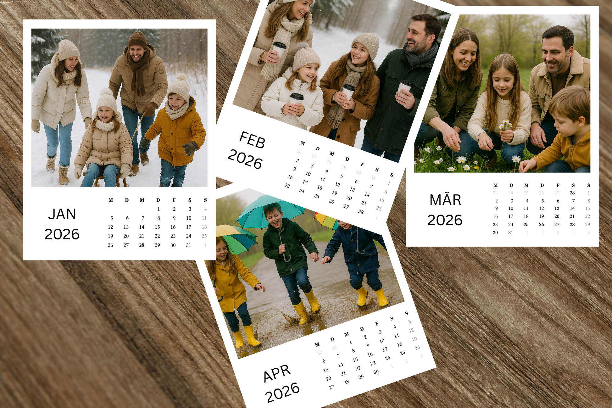 - 12 Monatsfelder mit deinen Fotos (1 Foto pro Monat)